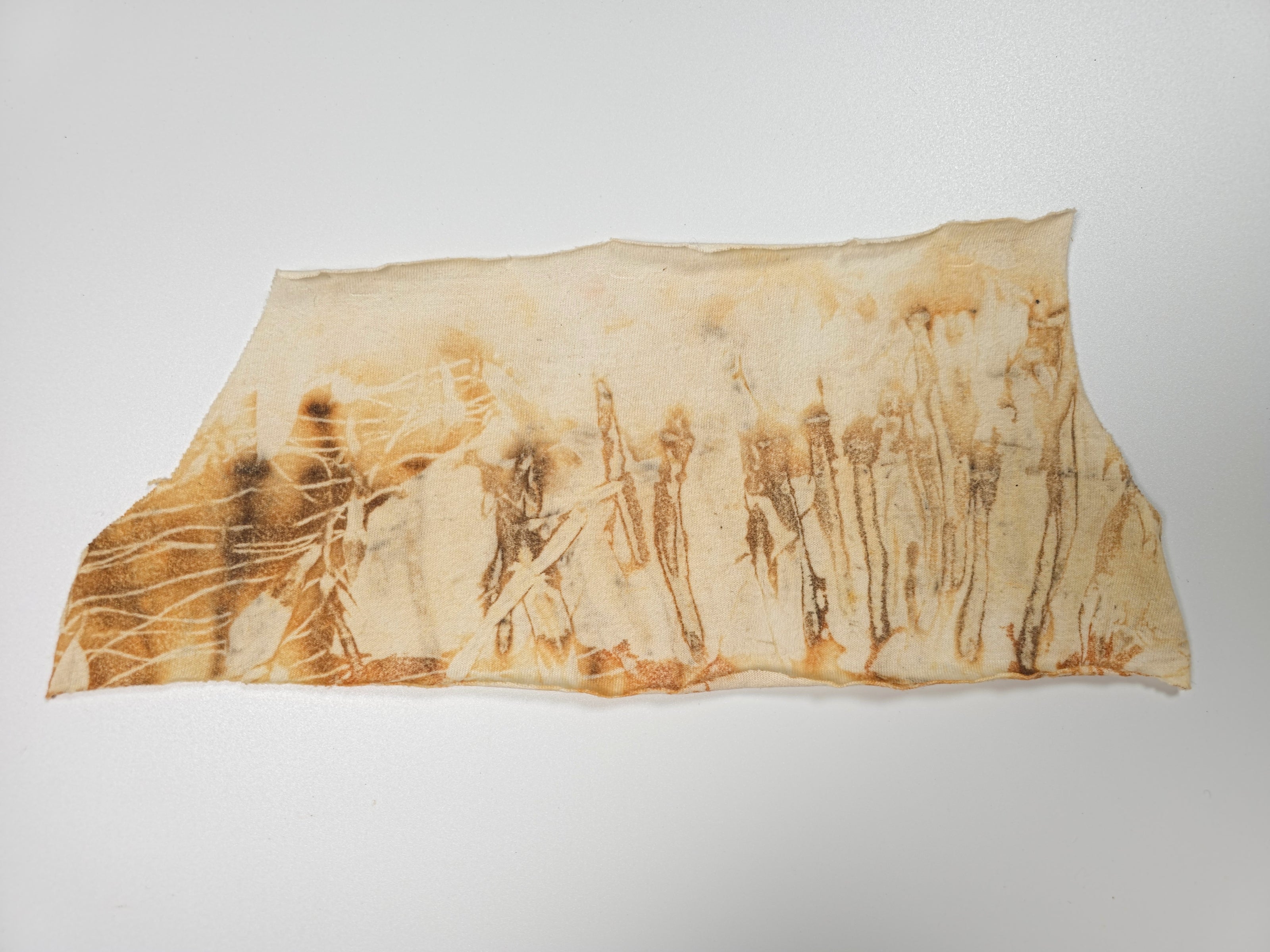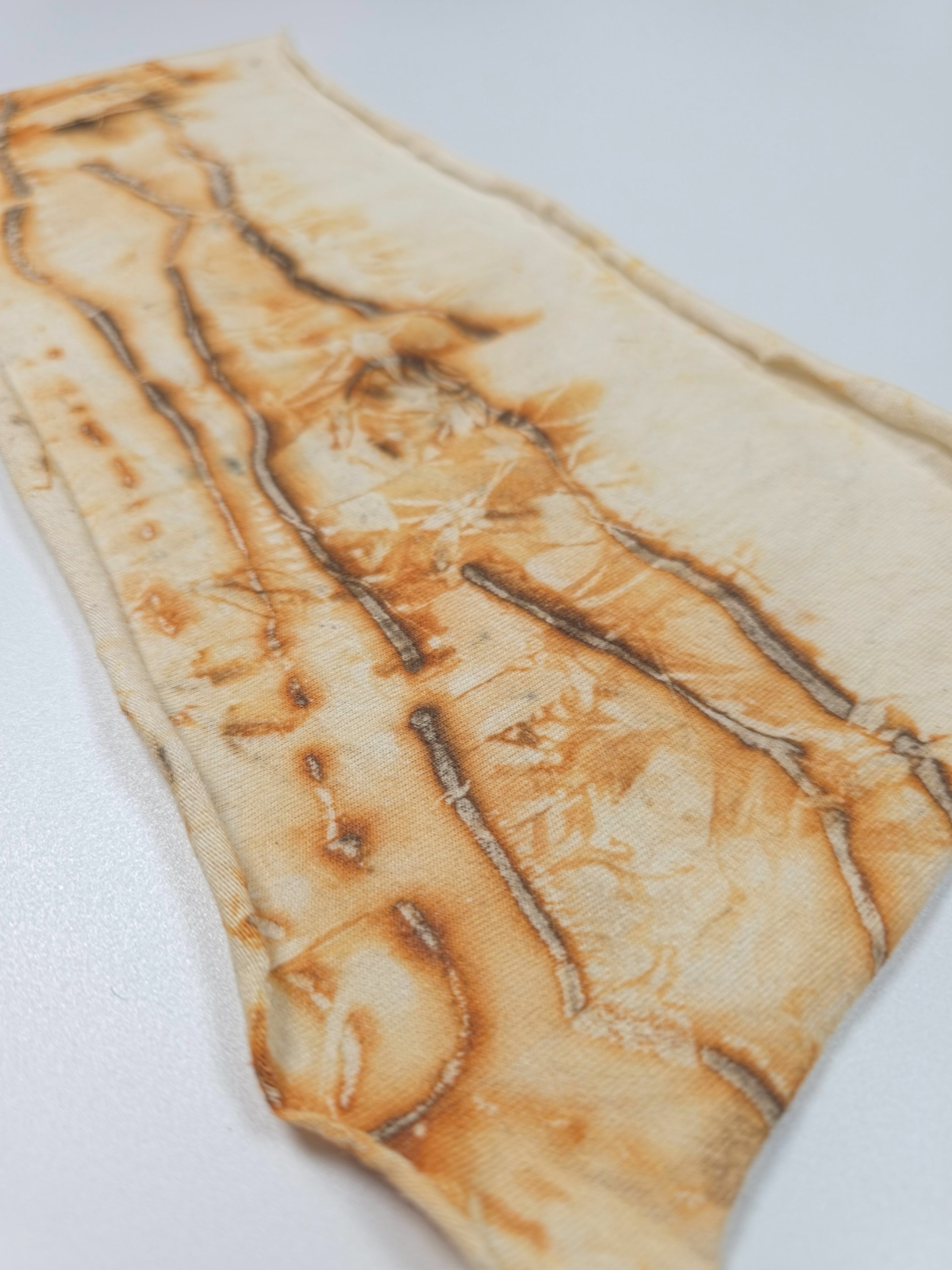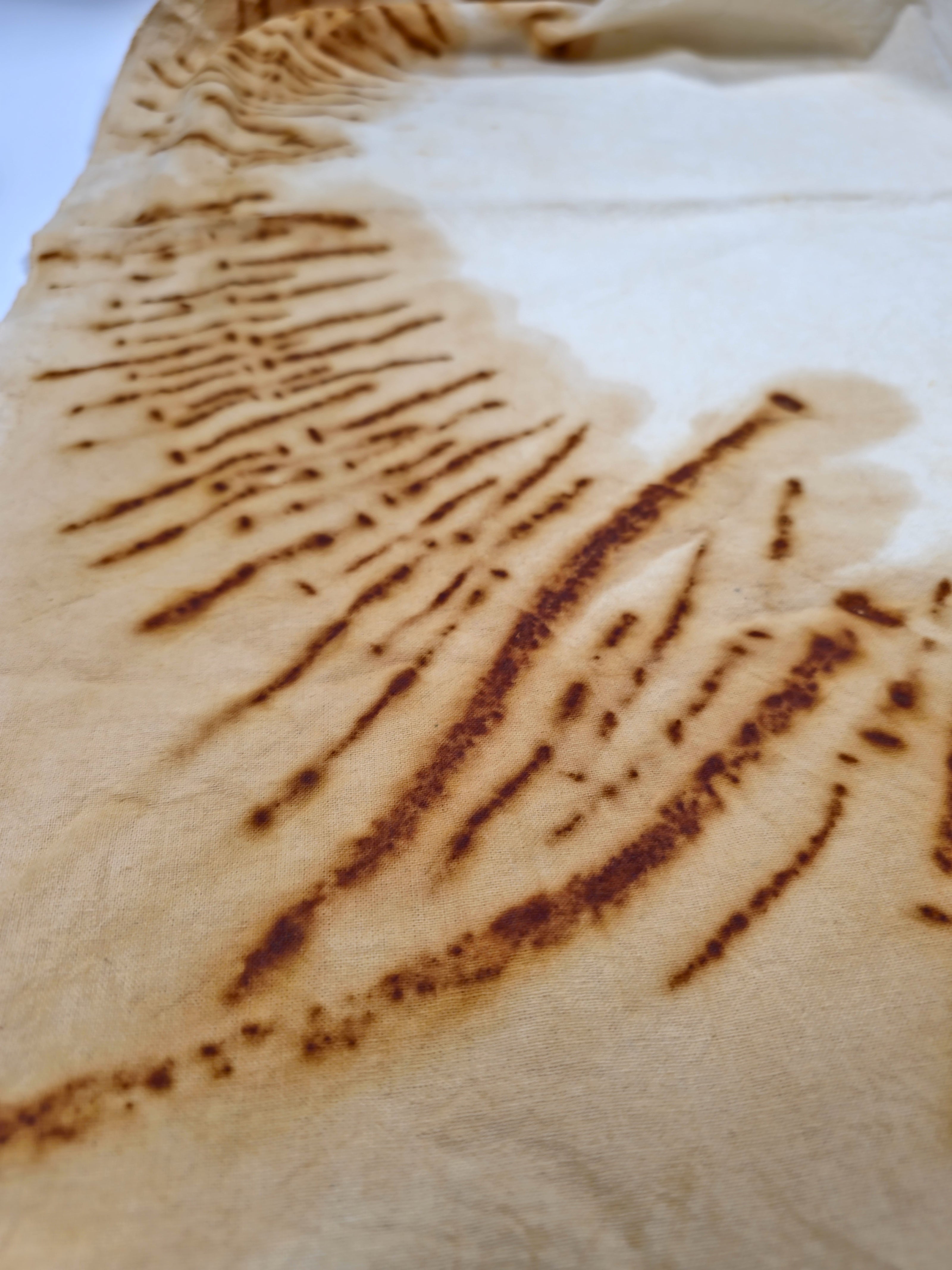 Applying heat accelerates the process and expands the colour range. From warm copper and sienna tones to deep greys and near black impressions. It also enhances definition, producing sharper, more detailed print. Images below are, cotton woven shirt and cotton jersey fabrics.