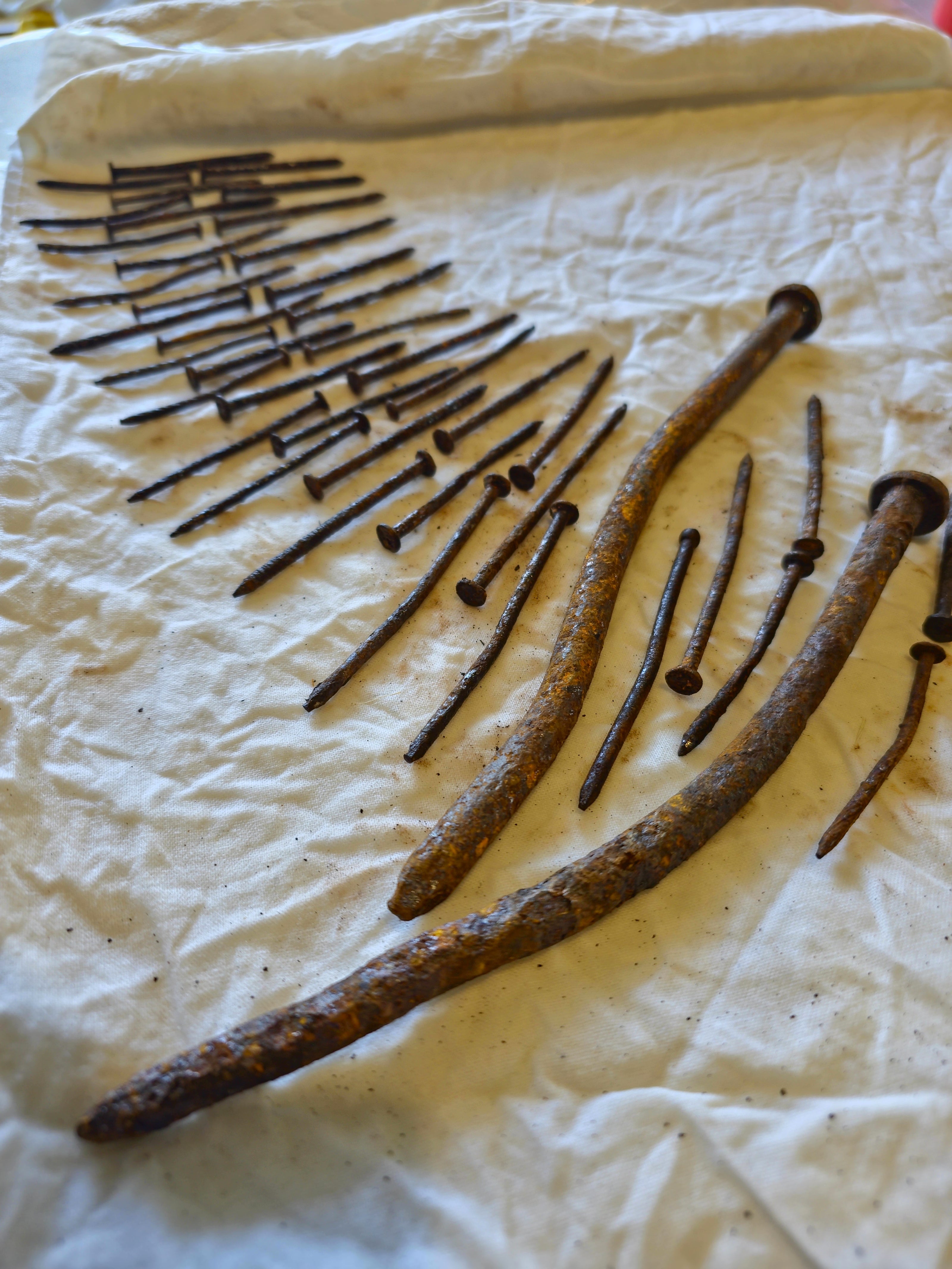 Using reclaimed materials like railway sleepers, old nails, discarded construction steel, and forgotten tools, the metal tell its story on the fabric. As the rust transfers onto the fibres it forms rich patterns and earthy tones of warm coppers, deep browns to smoky greys, often with beautiful surprises.