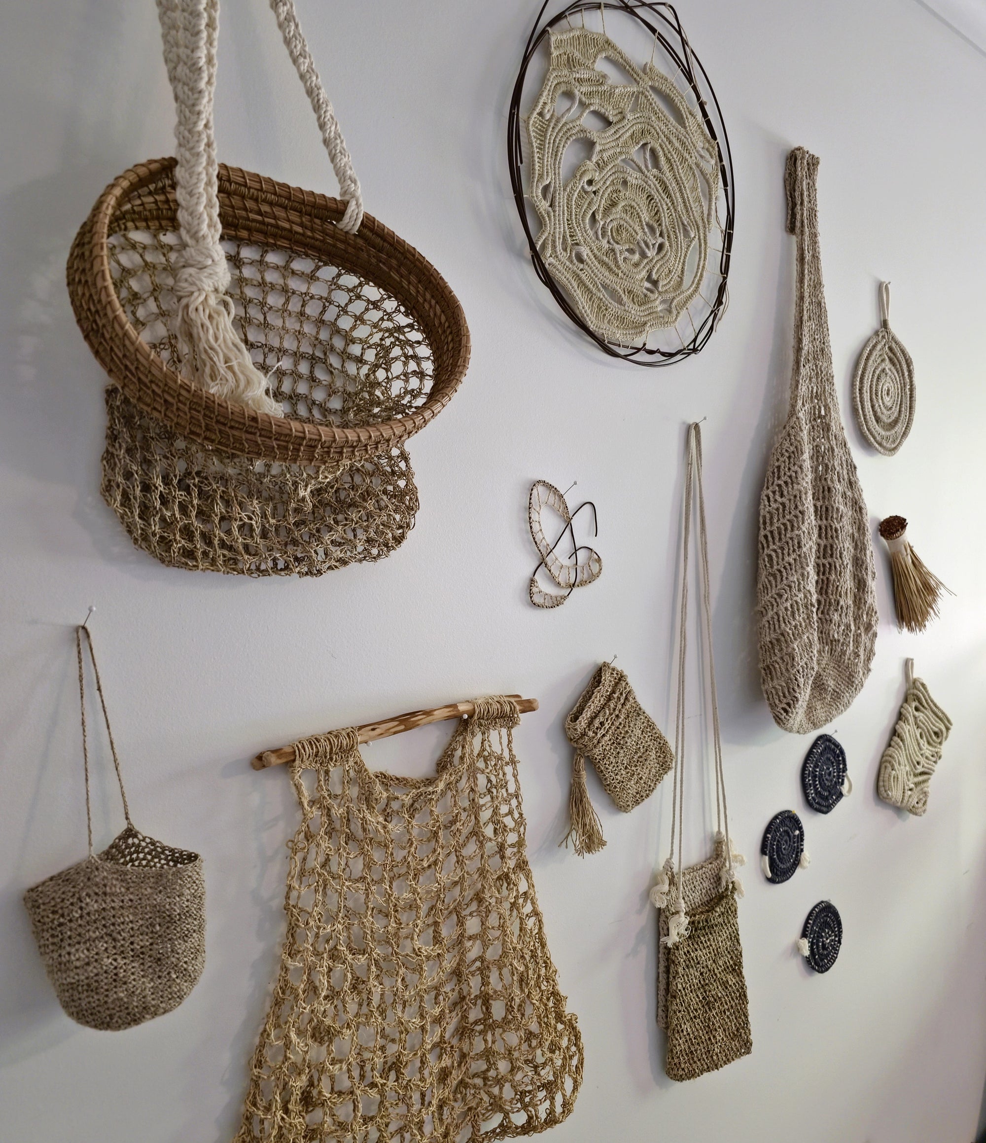 Her creative practice is materials-led, focusing on natural fibres and repurposed materials to create both functional and decorative work.