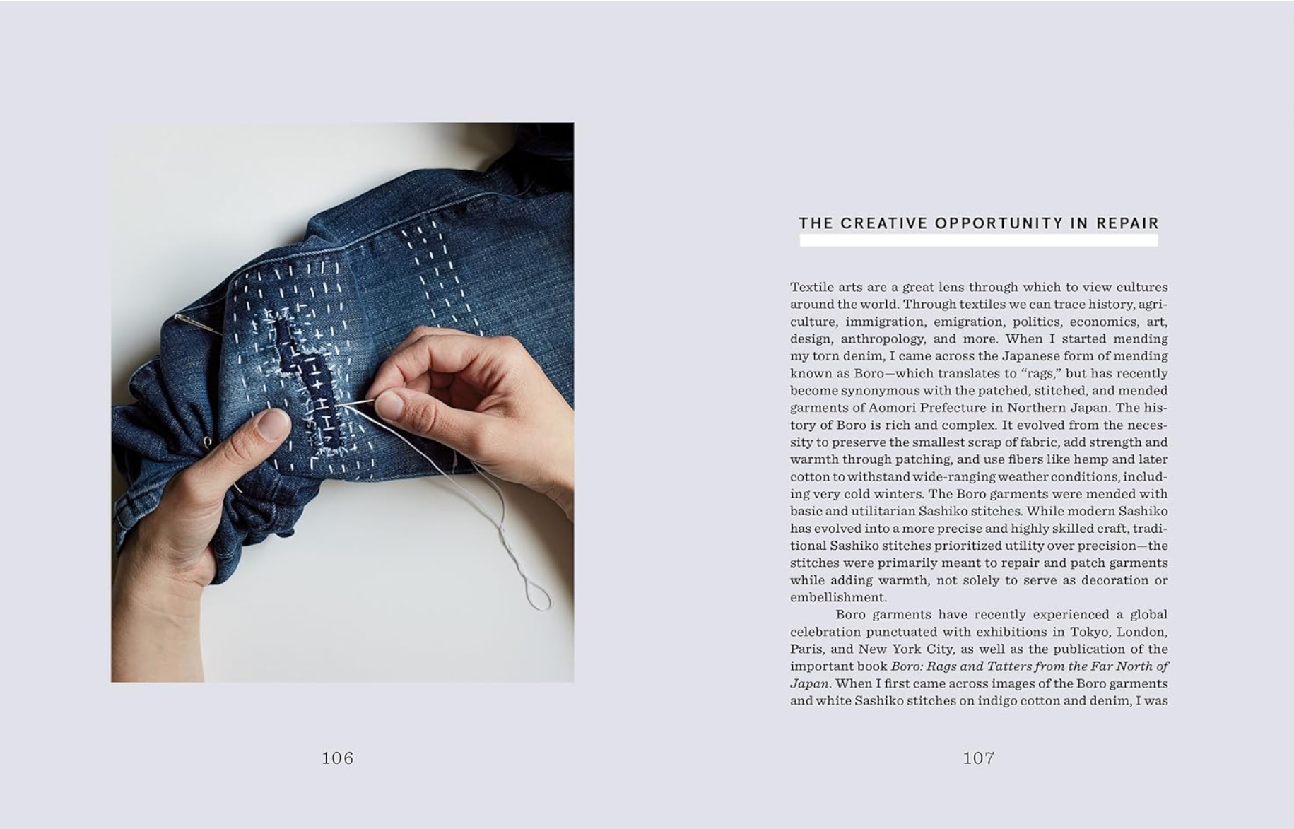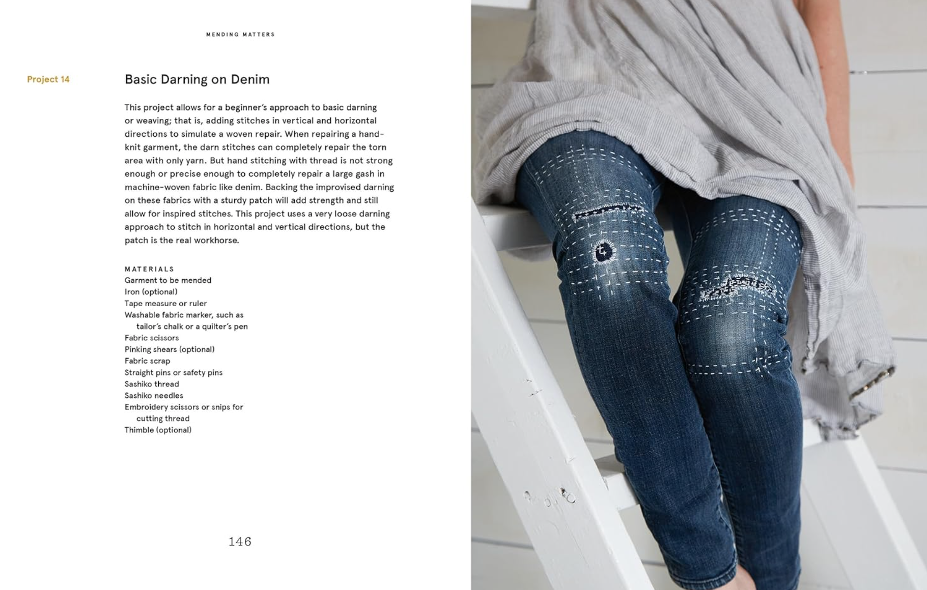 First, it includes more than 20 hands-on projects that showcase current trends in visible mending that are edgy, modern and bold, but draw on traditional stitching. It does all this through just four very simple mending techniques: exterior patches, interior patches, slow stitches, darning and weaving.