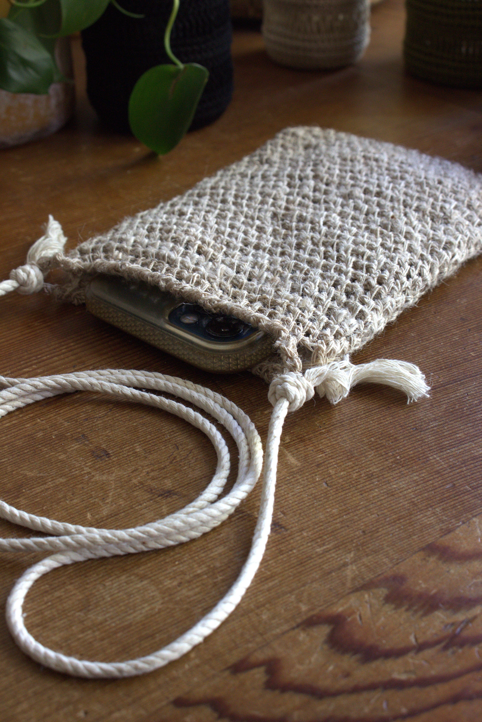 The pouch is designed to fit most phone sizes plus a bit extra. The rope length can be whatever you need. from a necklace to a small side bag.