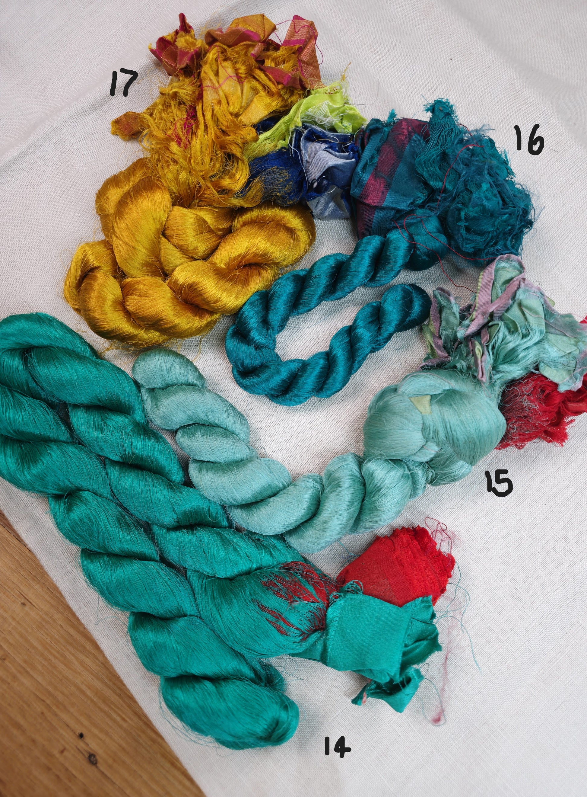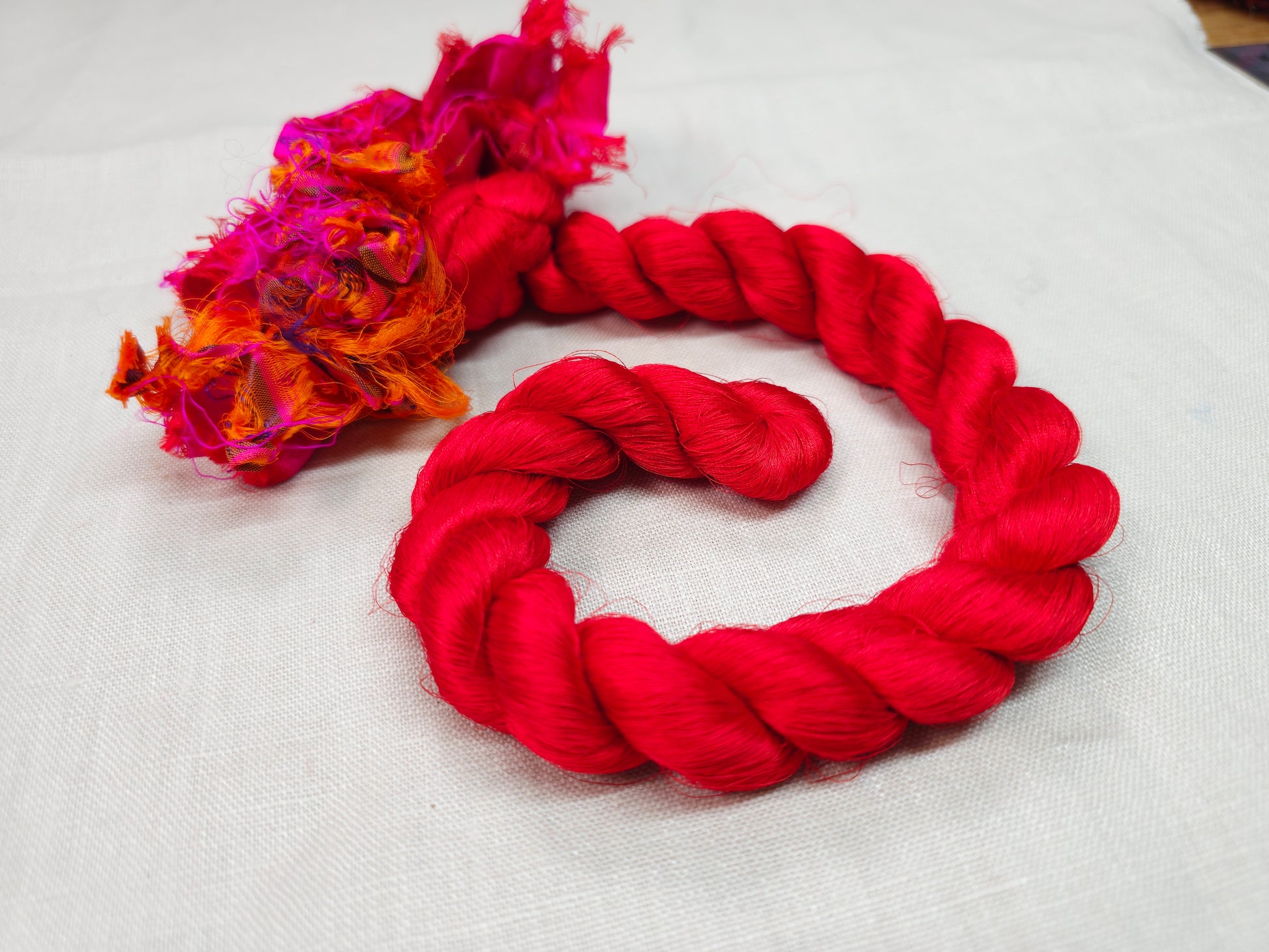 Sari silk thrums are the remnant threads from sari fabric weaving. These threads are twisted into hanks, with the fabric selvage is still attached. Each skein is sold separately, weight and thread lengths vary between each hank.